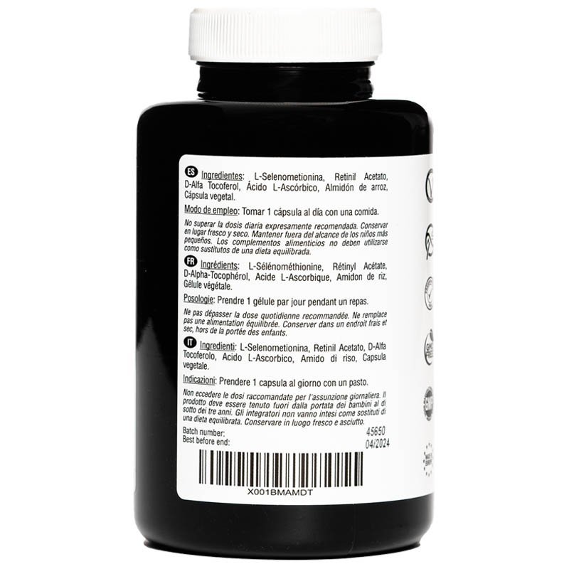 L-selenometionina. acetato de retinol. D-alfa tocoferol. ácido L-ascórbico. amido de arroz. cápsula vegetal.