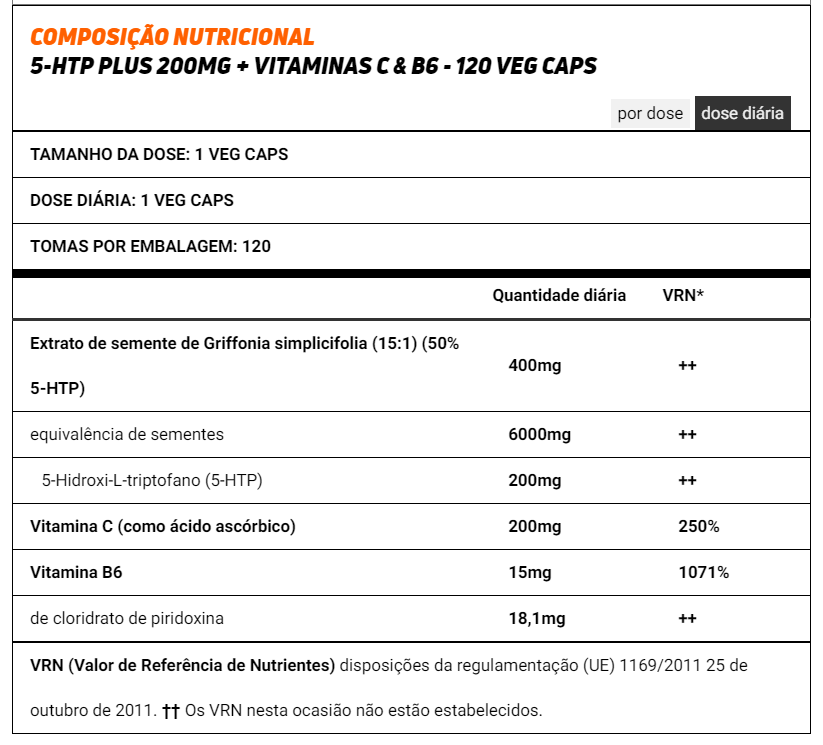 O 5-HTP Plus 200mg + Vitaminas C & B6 da é um suplemento alimentar em cápsulas vegetais feito a partir de extrato 15:1 de sementes de Griffonia simplicifolia estandardizado a 50% de 5-HTP, vitamina C na forma de ácido ascórbico e vitamina B6 na forma de cloridrato de piridoxina.