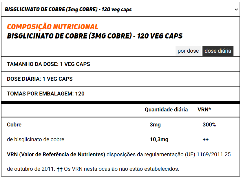 O cobre é um oligoelemento essencial do organismo cuja ingestão de referência é de 1mg por dia. de acordo com a regulamentação europeia.