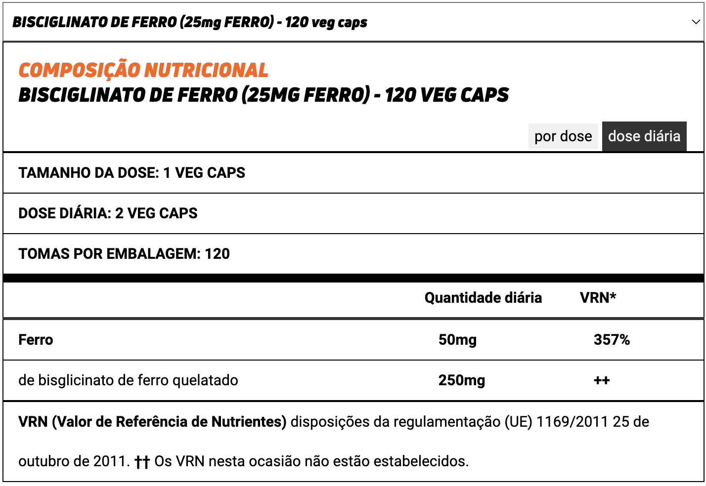 PROPRIEDADES DO FERRO O ferro contribui para a função normal do sistema imunitário. O ferro contribui para o metabolismo energético normal. O ferro contribui para a formação normal de glóbulos vermelhos e hemoglobina. O ferro contribui para o transporte normal de oxigénio no corpo. O ferro contribui para a redução do cansaço e da fadiga. O ferro contribui para a função cognitiva normal. O ferro contribui para o processo de divisão celular.PORQUÊ COMPRAR O BISGLICINATO DE FERRO NA HSN?FórmulaO ferro isolado é realmente pouco absorvido.Normalmente o ferro que é melhor absorvido chama-se ferro heme. presente na hemoglobina e na mioglobina na carne vermelha e nas miudezas animais.Mas por vezes. por restrições éticas ou outras razões. não conseguimos obter ferro suficiente destas fontes e temos de recorrer a fórmulas alternativas. Um destes é a suplementação alimentar.Muitas empresas comercializam apresentações do ferro de baixa biodisponibilidade porque são mais baratas.No nosso caso. de HSN trazemos-lhe a forma de alta biodisponibilidade do bisglicinato de ferro. uma conjugação de ferro com o aminoácido glicina que actua como quelante. aumentando a sua absorção e reduzindo o desconforto gastrointestinal que produz.IINGREDIENTESFarinha de arroz. bisglicinato ferroso. cápsula vegetal [agente de revestimento (hidroxipropilmetilcelulose)]. antiaglomerante (L-leucina). antiaglomerante (fosfato tricálcico).COMO TOMAR BISCIGLINATO DE FERRO (25MG FERRO)Tome 1 cápsula vegetal. 2 vezes ao dia. de preferência antes das refeições.