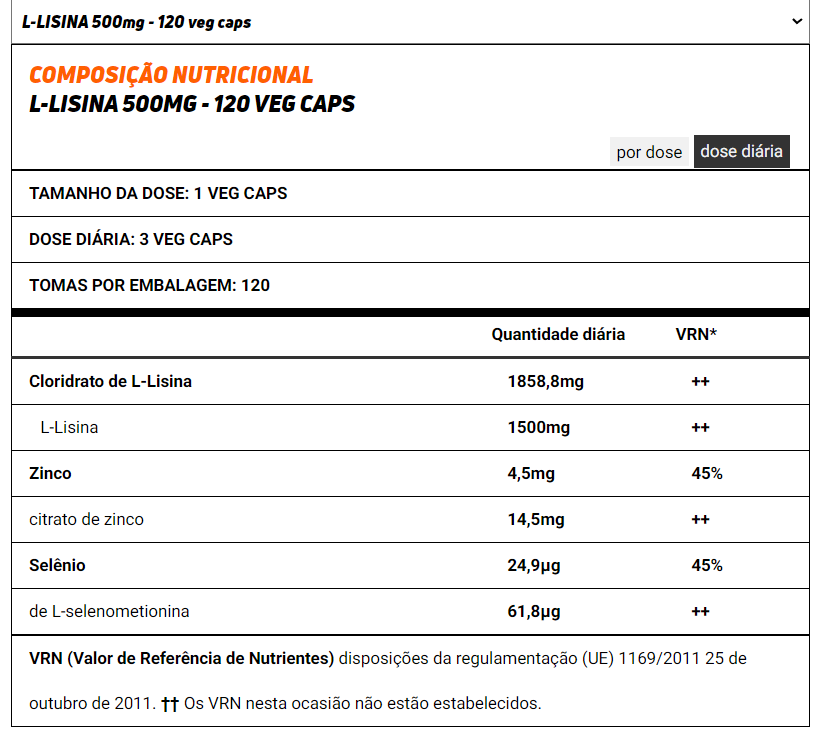 L-lisina 500mg é um suplemento alimentar apto para dietas vegans.