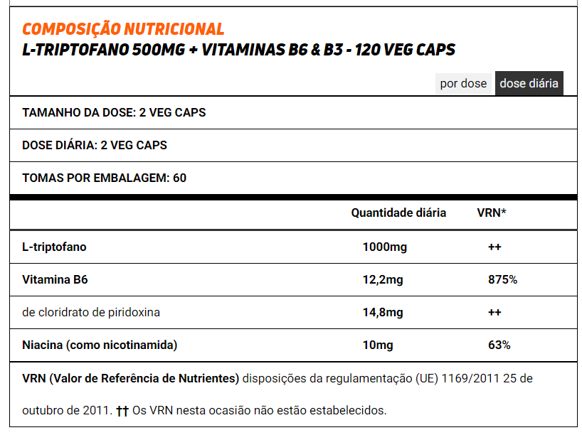 L-triptofano (produzido através de um processo de fermentação vegetal). cápsula vegetal [agente de revestimento (hidroxipropilmetilcelulose)]. agente de volume (celulose microcristalina). estabilizador (hidroxipropilmetilcelulose). cloridrato de piridoxina (vitamina B6). nicotinamida (vitamina B3). antiaglomerante (sais de magnésio de ácidos gordos).