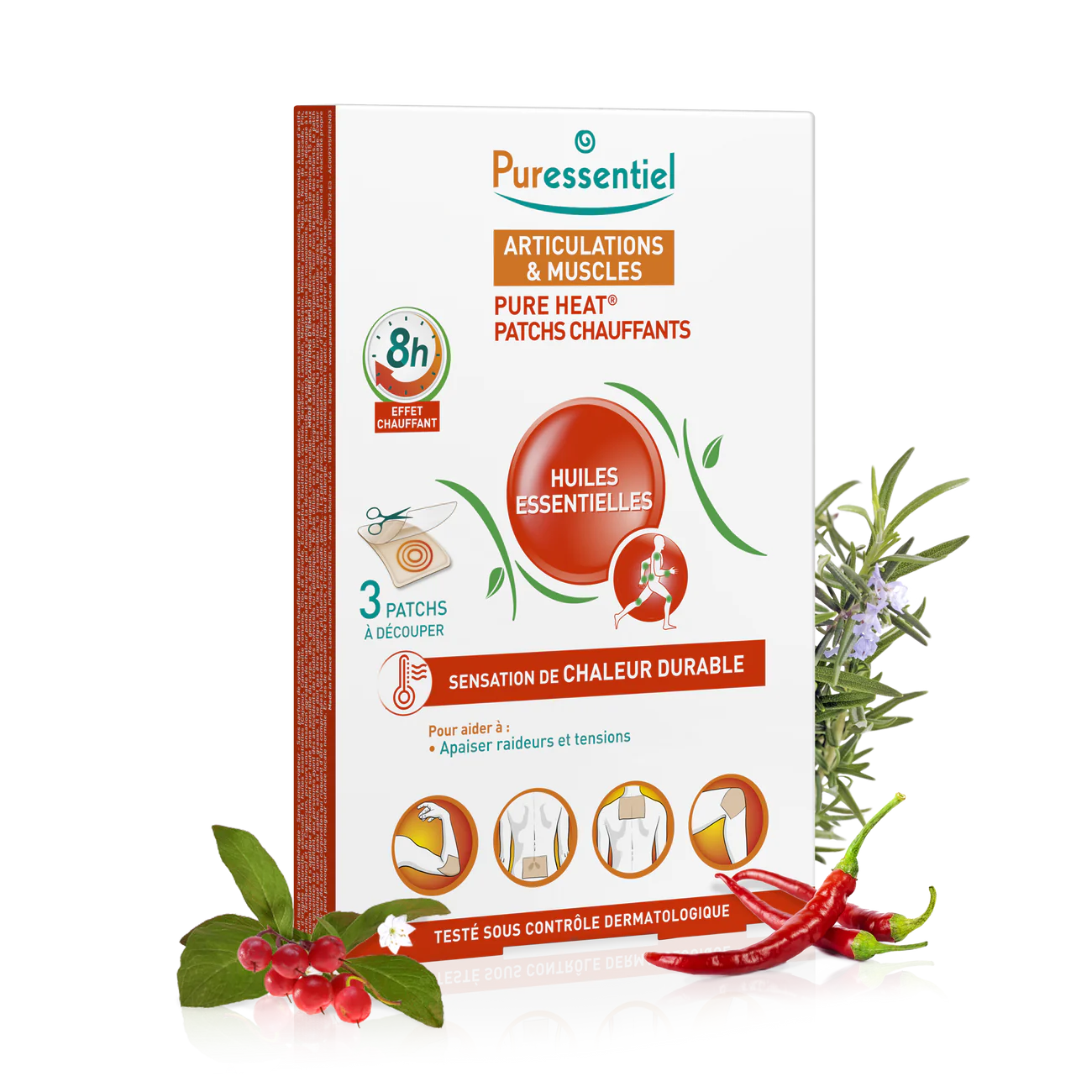 Os pensos térmicos Pure Heat® ajudam a aliviar áreas sensíveis e tensão muscular. A sua fórmula. combinando 14 óleos essenciais e Capsicum. proporciona uma agradável e duradoura sensação de calor durante 8 horas. o que ajuda a relaxar o músculo. Este penso de aquecimento flexível e inodoro é invisível sob a roupa e adapta-se à todos os movimentos. Pode ser cortado à medida e aplicado diretamente em todas as áreas sensíveis do corpo (costas. joelho. pescoço. ombro. cotovelo. pulso. coxa. barriga da perna. panturrilha. etc).