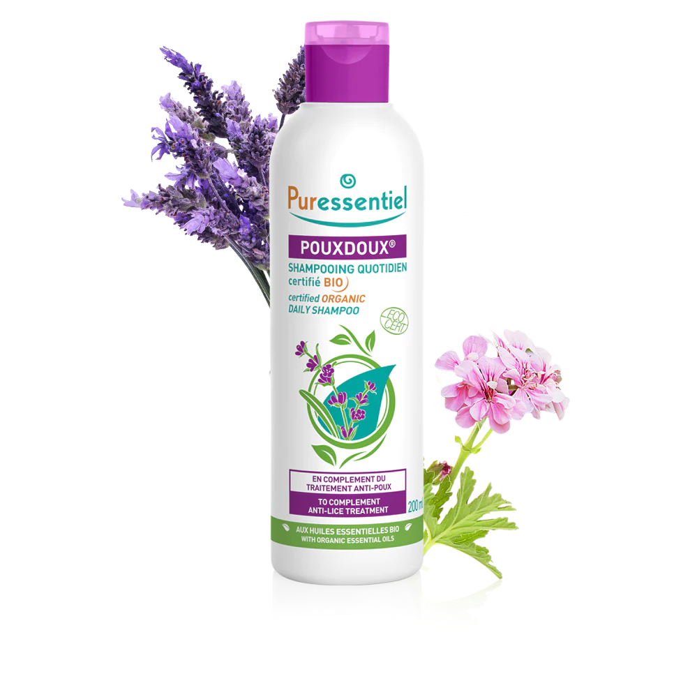 Para complementar a loção Puressentiel Anti-Piolhos: com óleos essenciais puros e naturais de lavanda. lavandim. ylang-ylang e gerânio – é formulado para limpar o couro cabeludo e ajudar a remover piolhos e lêndeas mortos. O shampoo suave POUXDOUX® ajuda a enxaguar a loção de tratamento Puressentiel Anti Piolhos do cabelo. Protege o cabelo e acalma o couro cabeludo.